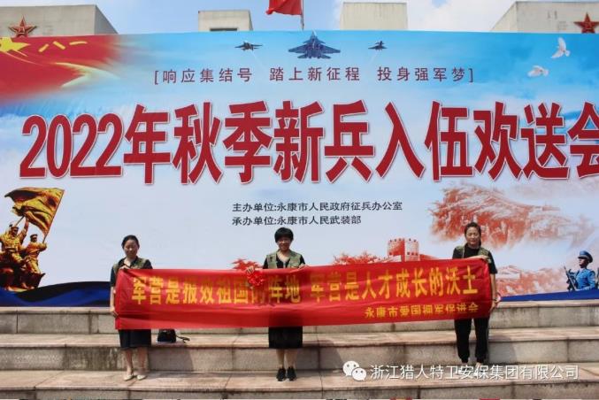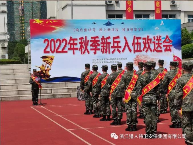 9月17日,永康市關(guān)愛退役軍人協(xié)會(huì)多舉措認(rèn)真做好2022年秋季新兵入伍工作。永康市關(guān)愛退役軍人協(xié)會(huì)理事單位---浙江獵人特衛(wèi)安保集團(tuán)有限公司會(huì)同永康市領(lǐng)導(dǎo)、軍區(qū)代表、永康市招兵辦公室及永康市退伍軍人事務(wù)局相關(guān)領(lǐng)導(dǎo)一起參加了今年的入伍新兵歡送會(huì)。