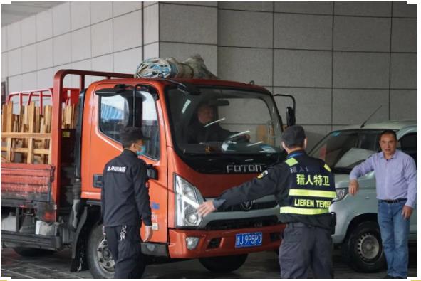 3月19日撤場當日,天空雖然下著雨,但是絲毫不影響獵人特衛堅守崗位的熱情。在場館各個入口,極具經驗的他們,指揮撤場貨車安穩停放,避免堵車、交通事故的發生。