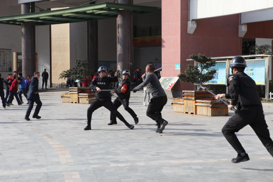校園防暴組收到警訊后,組長冉坤陽迅速通知全體成員就地拾取防暴器械或工具趕往事發區域,短短的三分鐘,政教處及年輕的男老師等十多名校園防暴組成員手持木棍、掃把就趕到了對峙現場。同時,冉坤陽等老師還利用教導育人的專業技能努力的與男子溝通,試圖阻止暴力行為。