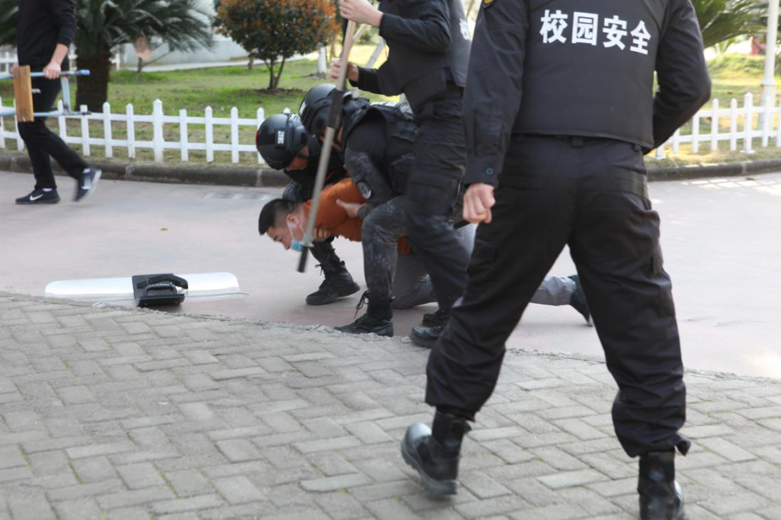 峙現場危機并未解除,二名男子非但不聽勸解,反而惱羞成怒,其中一邊大聲嚷著“學校不準我們送外賣進入,是斷我們的財路,我們必須向校長討個說法”,一邊揮舞著手中的鐵棍襲擊安保人員。現場人員見勸解無效,只能強行制服。而就在其中一名男子被制服時,另一名男子卻利用警戒松動之機沖出包圍圈,直奔教師辦公樓。與此同時,現場警戒的老師忽然發現另有一名男子翻入圍墻。狡猾的歹徒分明是在“聲東擊西暗度陳倉”,但保安員及學校防暴組成員隨機應變,迅速采取分組攔截措施,此時保安公司指揮出警的應急出警隊員正好趕到,并合力將歹徒制服。